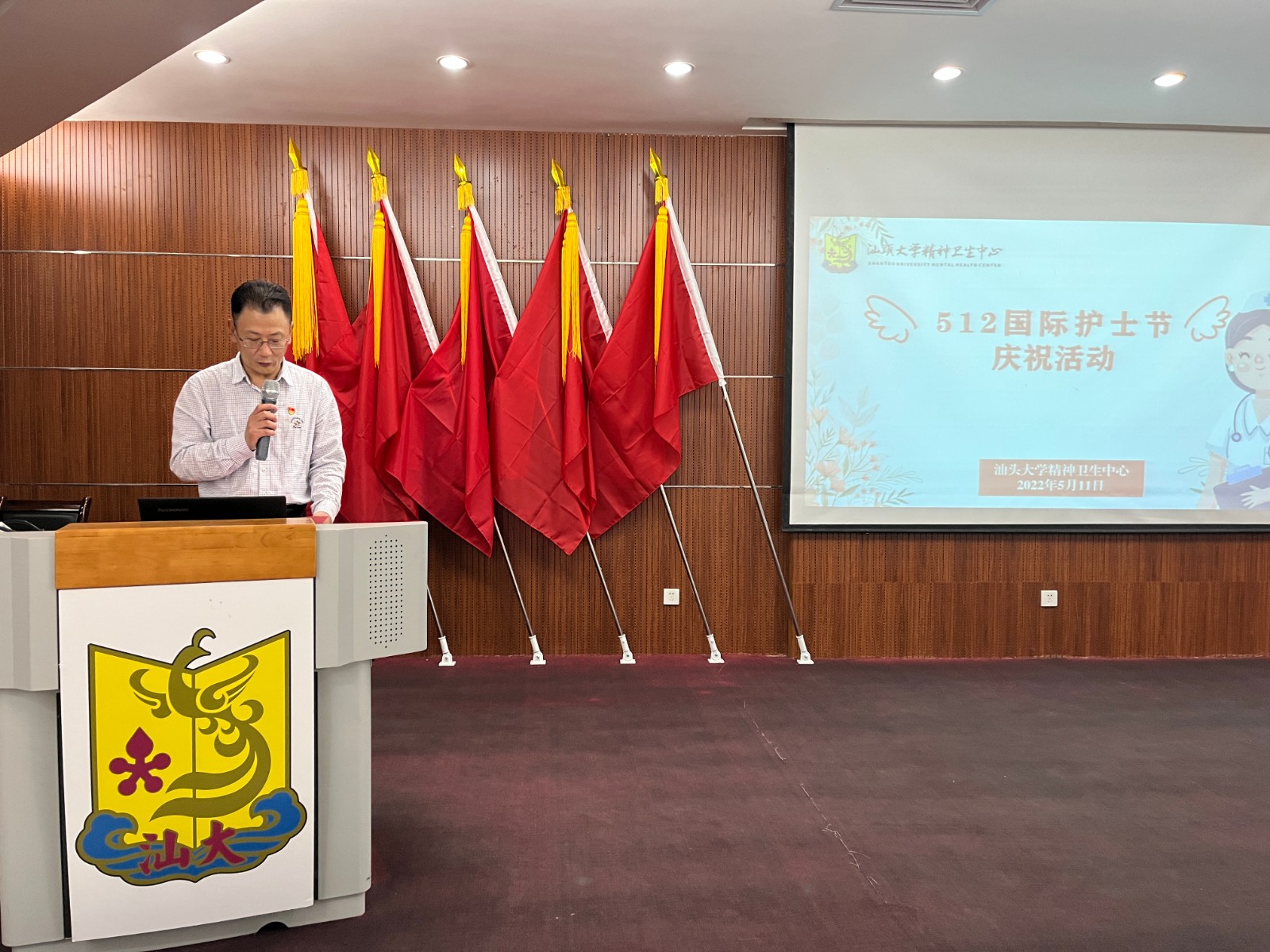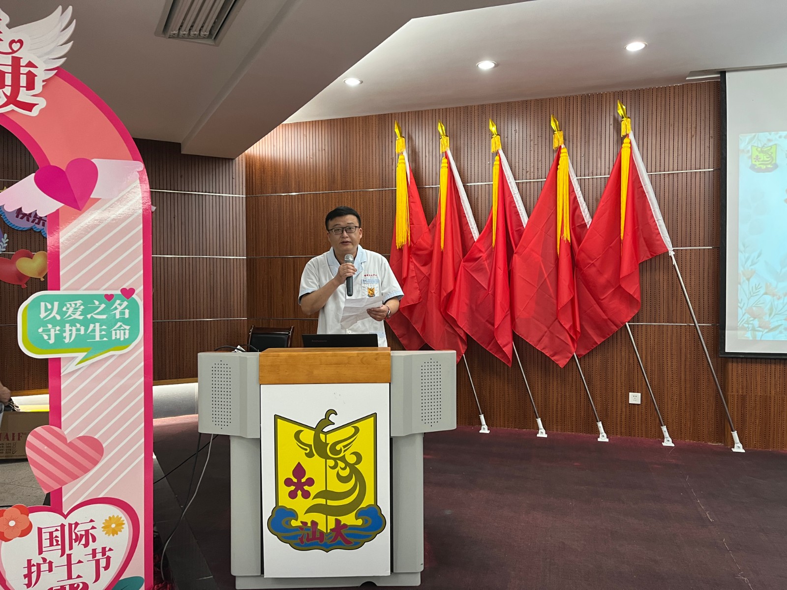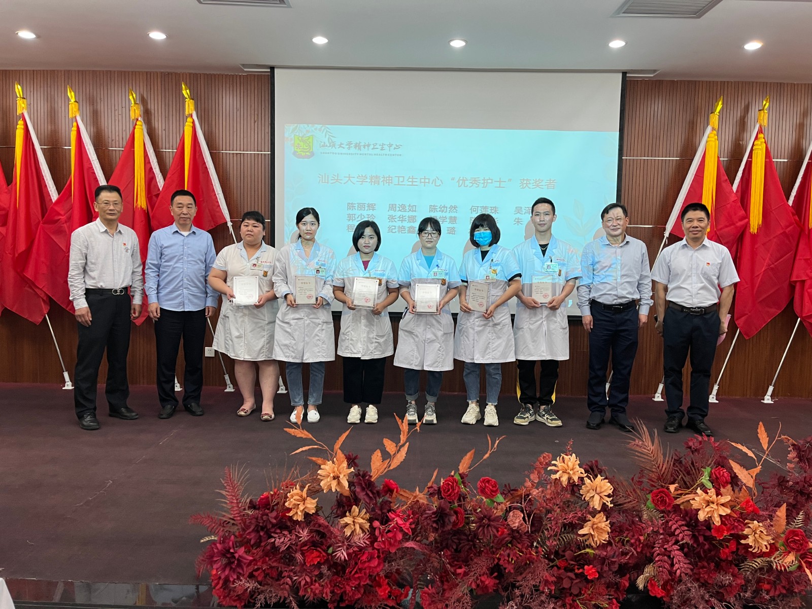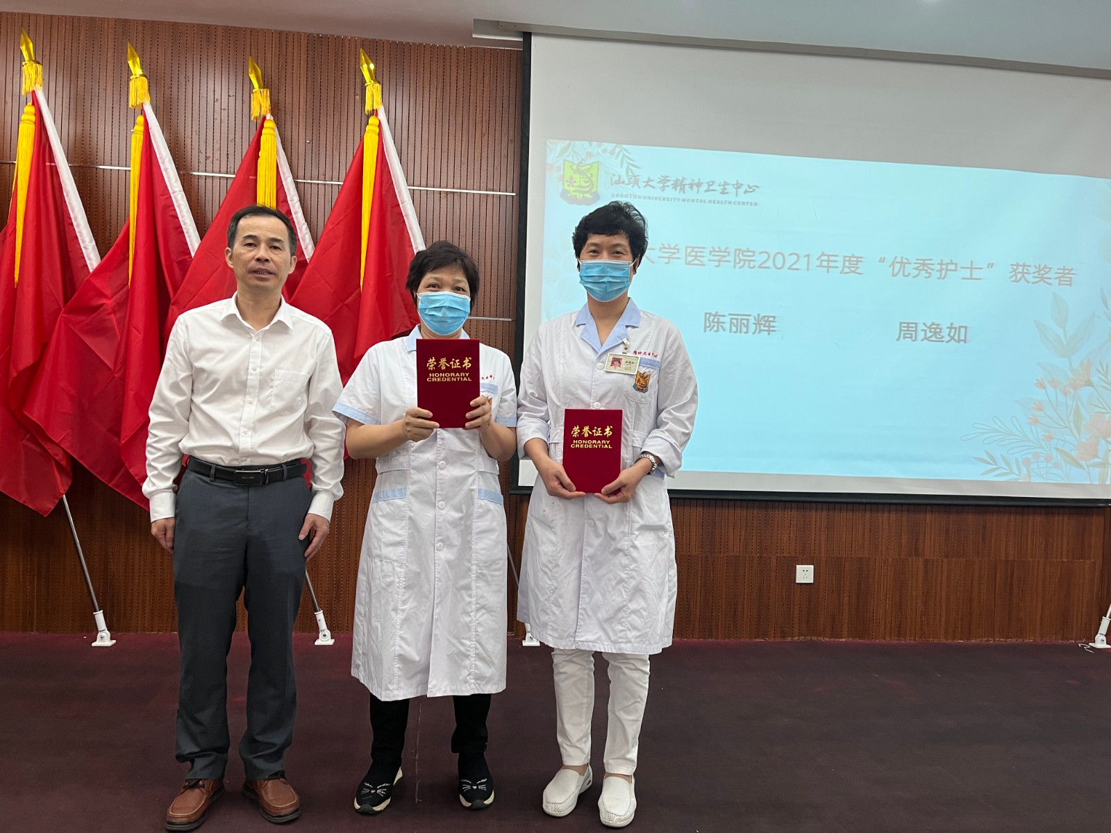 会上举行表彰仪式,陈楚群书记为精卫中心荣获汕头大学医学院2021年度优秀护士陈丽辉、周逸如2名同志颁奖;医院党政领导班子为医院14名荣获2021年优秀护士颁奖。