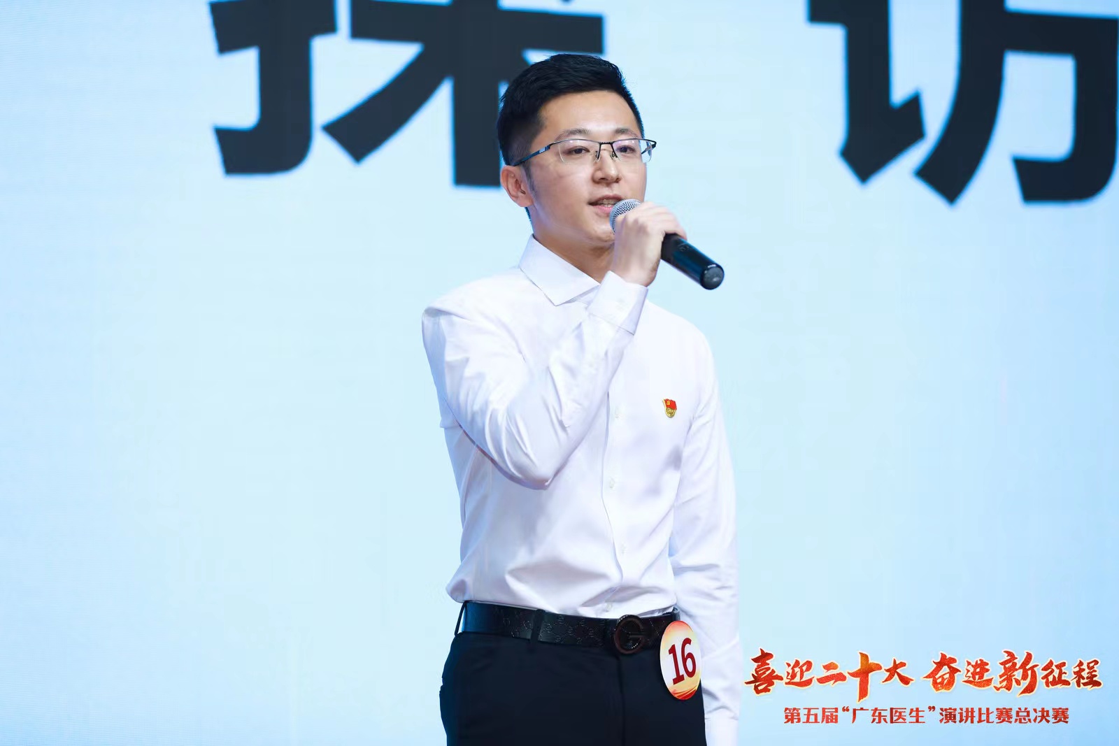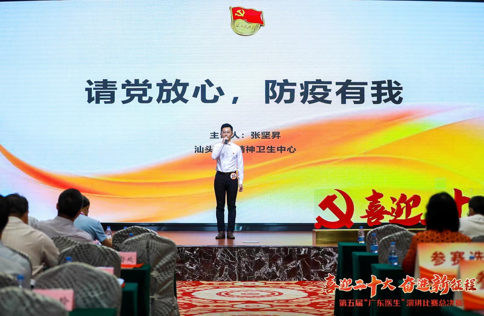 总决赛现场,25位演讲者用最真挚的声音,讲述了来自临床和抗疫一线的感人故事。我院张坚昇同志以《请党放心,防疫有我》为题,通过讲述疫情期间我院为患者首创“云探访”的故事,满怀深情地述说着新时代青年医务工作者在党的领导下用爱坚守、埋头苦干的责任担当,收获现场观众共鸣。