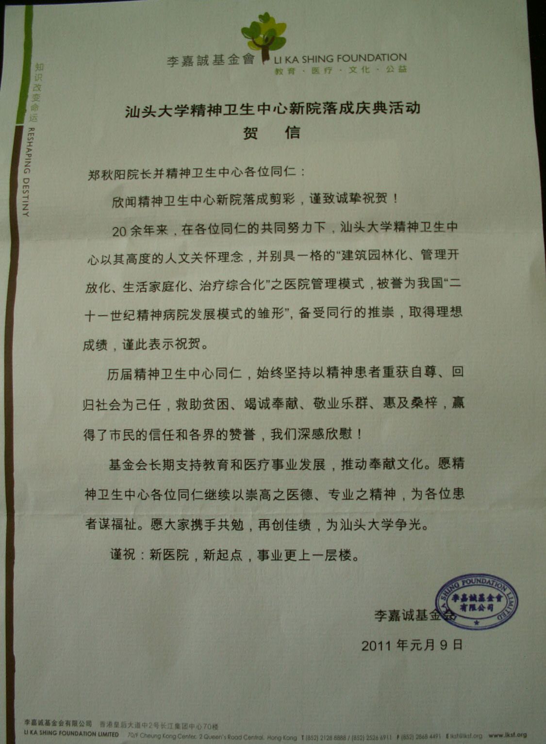 李嘉诚基金会致汕头大学精神卫生中心贺信