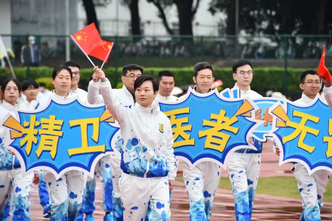 在运动会开幕式上,由汕头大学精神卫生中心30名职工组成的运动员方队以整齐划一的方阵、饱满的步伐步入运动场。“汕大精卫 医者无畏”铿锵有力的口号,充分展示了精卫人踔厉奋发、笃行不怠的积极精神风貌。