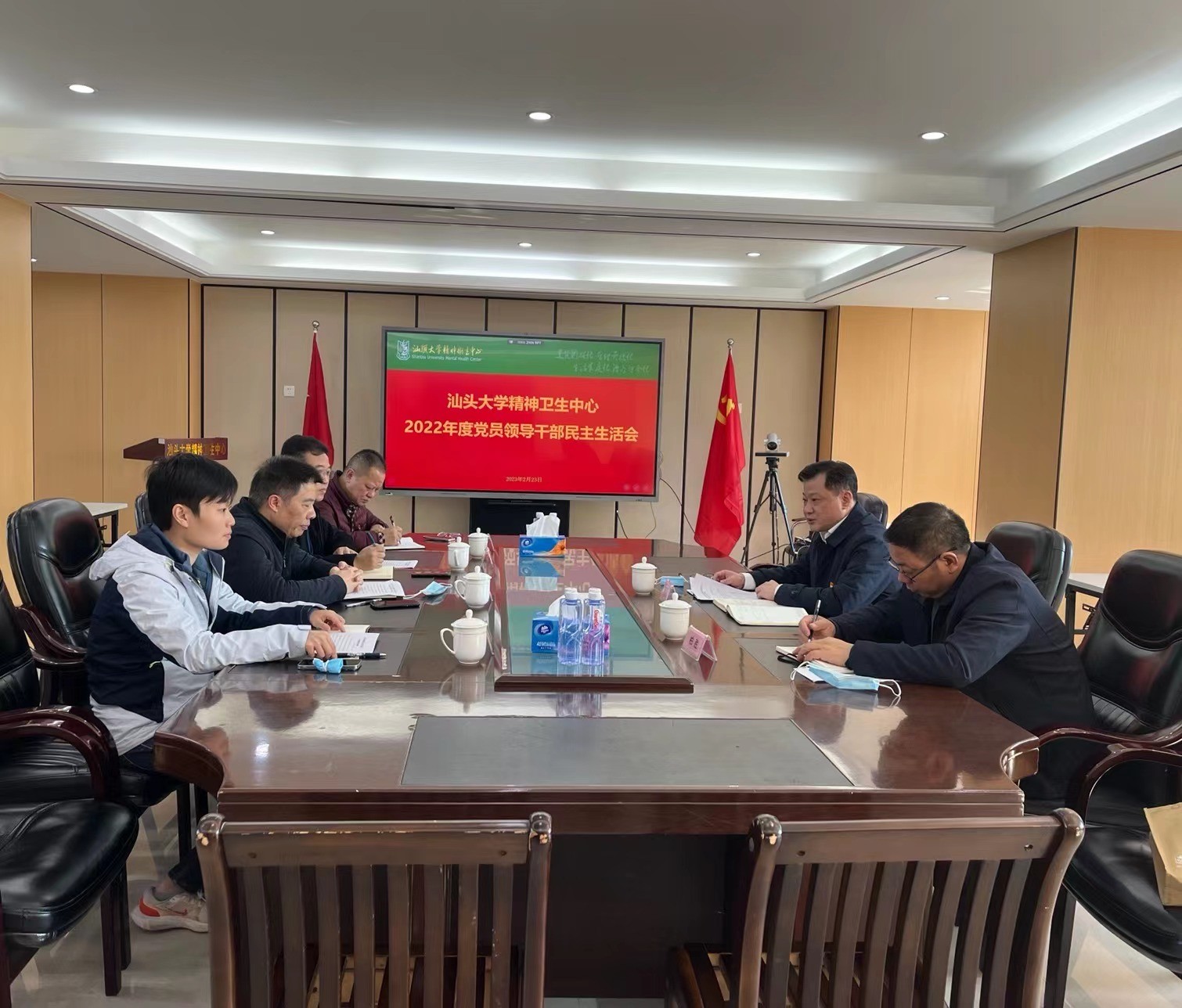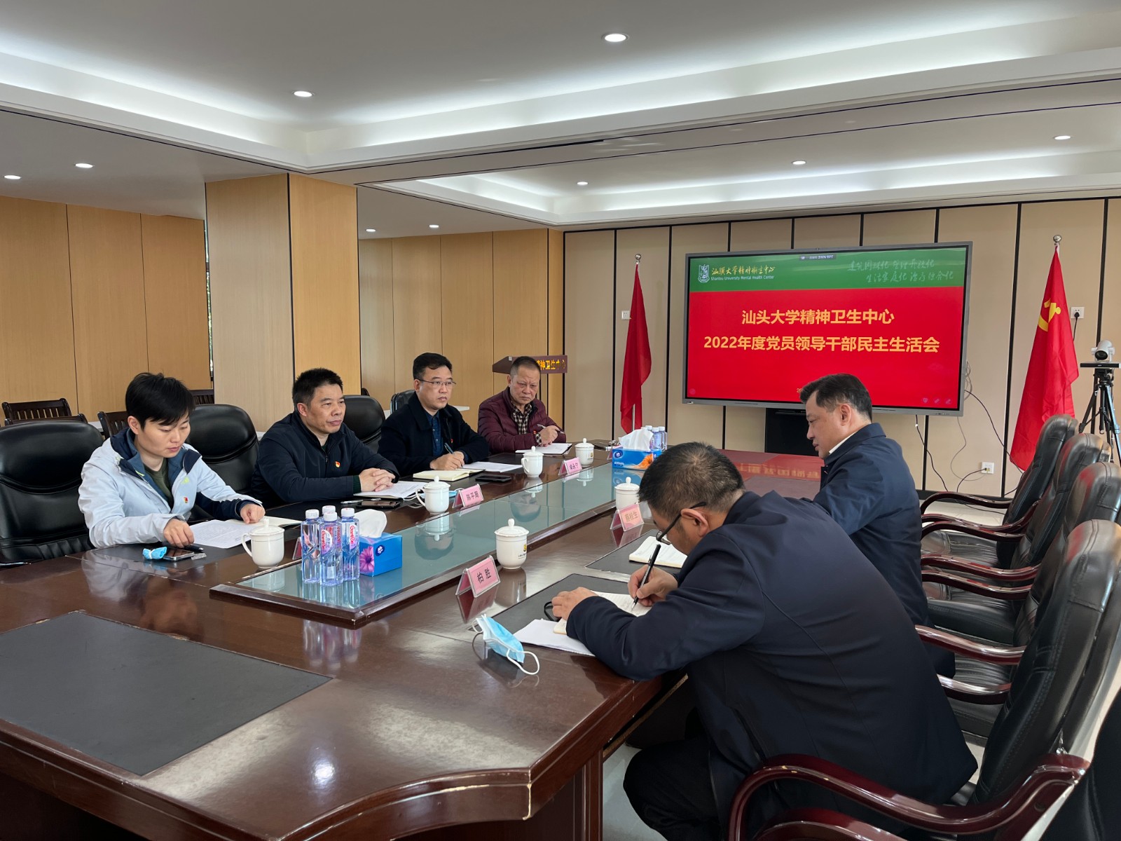 按照汕头大学医学院《关于开好医学院2022年度二级党组织党员领导干部民主生活会的通知》精神,2月23日下午,精神卫生中心召开2022年度党员领导干部民主生活会。会议由党总支书记蔡桂生同志主持学院督导组成员大学纪委委员、医学院纪委委员、计财处处长柏胜同志莅会督导,医院领导班子成员、党总支委员、党办主任参加会议。