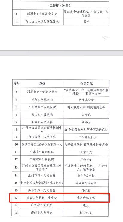近日,由广东省卫生健康委、广东省中医药局、广东省疾病预防控制局联合发文的“勇当先锋示范 共筑健康广东”广东医生系列主题活动评选结果出炉!汕大精卫中心报送的微电影《我的治郁日记》荣获全省二等奖。