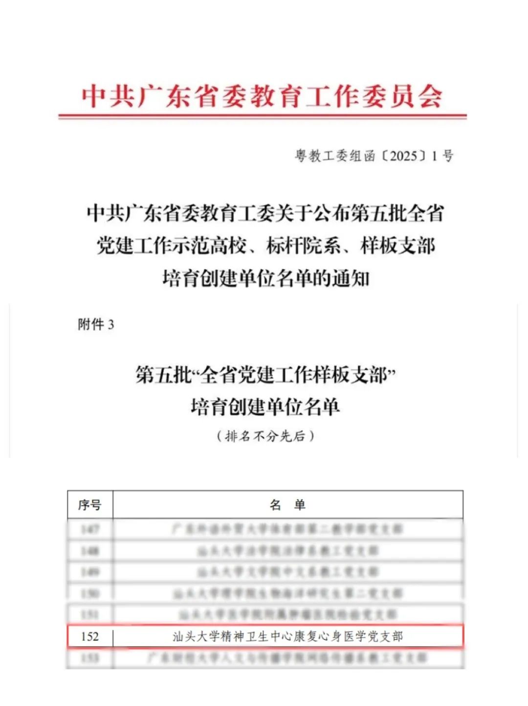 近日,中共广东省委教育工委公布全省第五批新时代高校党建示范创建和质量创优工作评审结果,康复心身医学党支部入选全省“党建工作样板支部”培育创建单位斩获殊荣。