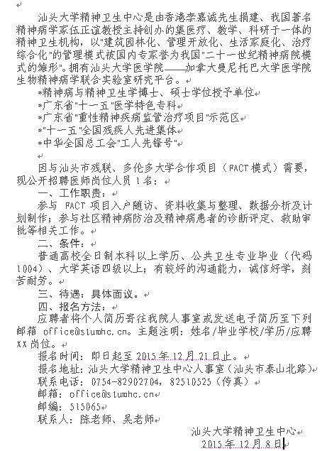 汕头大学精神卫生中心招聘医师岗位人员启事