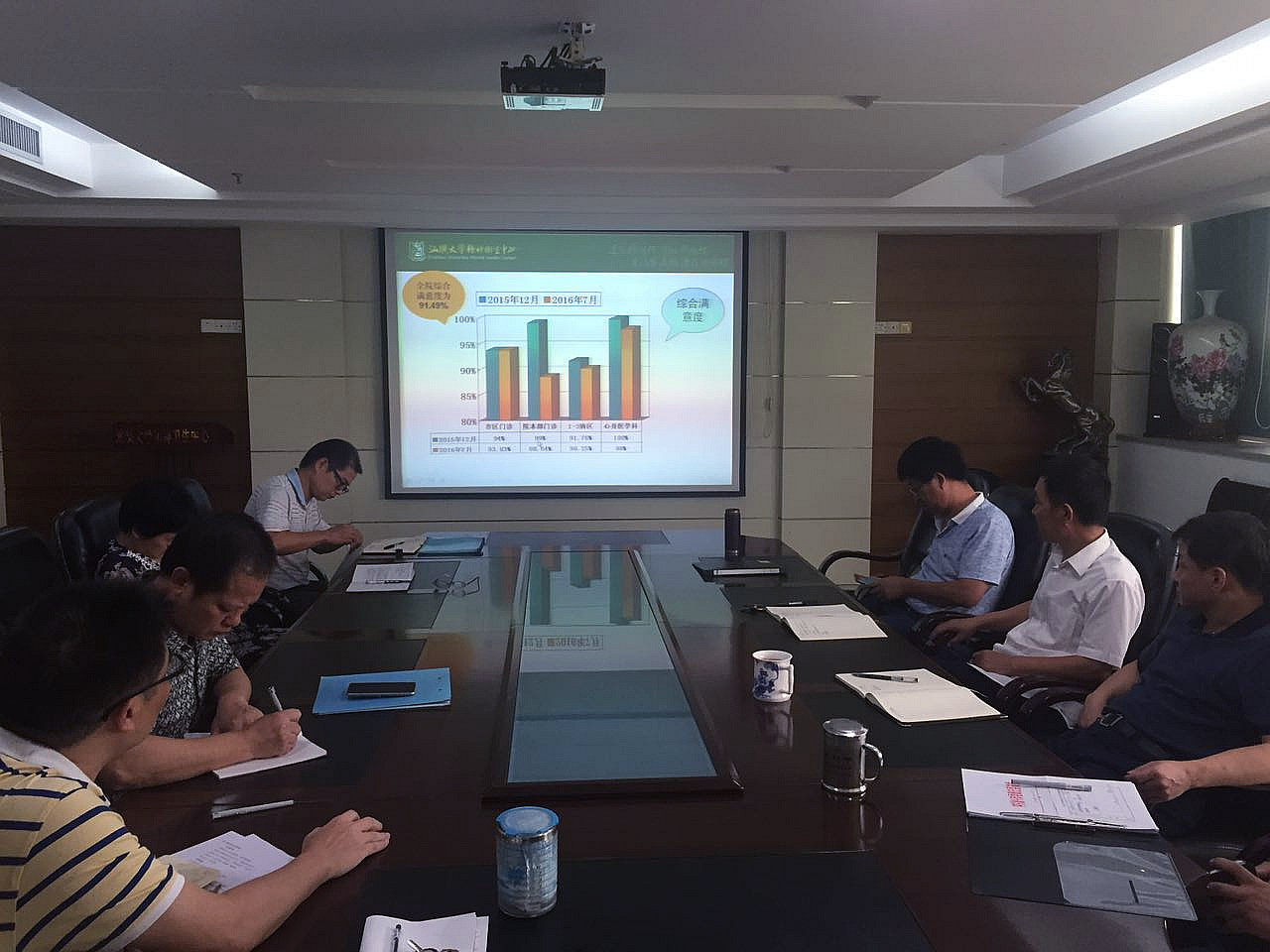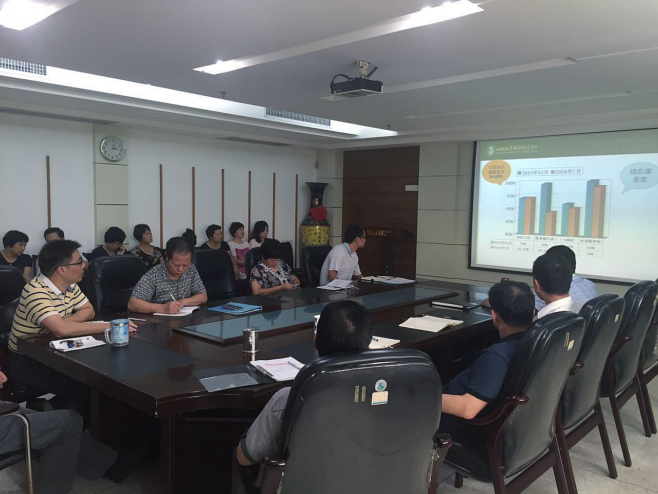 会议的主要内容是对中心2016年上半年所做的病人问卷调查情况进行反馈。调查显示,中心的综合满意度为91.49%,其中医生、护士、药房、检验、心电图、脑电图工作人员服务态度的满意度均为100%,无开大处方、乱收费、滥检查及指定药店现象,无收受现金和红包现象。调查中还收集到患者及家属的许多意见和建议,其中,家属及患者普遍对医院的环境、医护人员的服务态度表示满意,有近10位医生受到家属的点名称赞,同时也反映了医院的门诊候诊时间较长、收费公开程度不足等问题。
