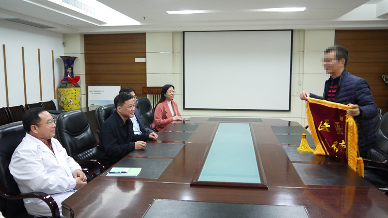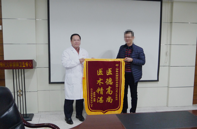 3月5日上午,患者廖姨的儿子彭某代表母亲,冒着大雨将一面绣有“医德高尚,医术精湛”的锦旗送到精神卫生中心蔡桂生书记及朱少毅主任医师的手中,他说,这是母亲的心愿,并转达了母亲对朱医生20年来的仁心仁德的感恩,及对医院秉持初心的感谢。