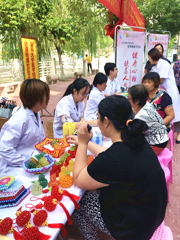 10月10日上午,中心社区义诊队、心理咨询小队分赴濠江区达濠社区和汕头市青少年活动中心,开展义诊和健康宣讲活动。达濠社区义诊活动中,中心义诊队为社区居民进行现场咨询,免费送医送药,并提供血压血糖测量,同时分发相关健康宣传材料,活动现场还有患者手工艺品展示等。