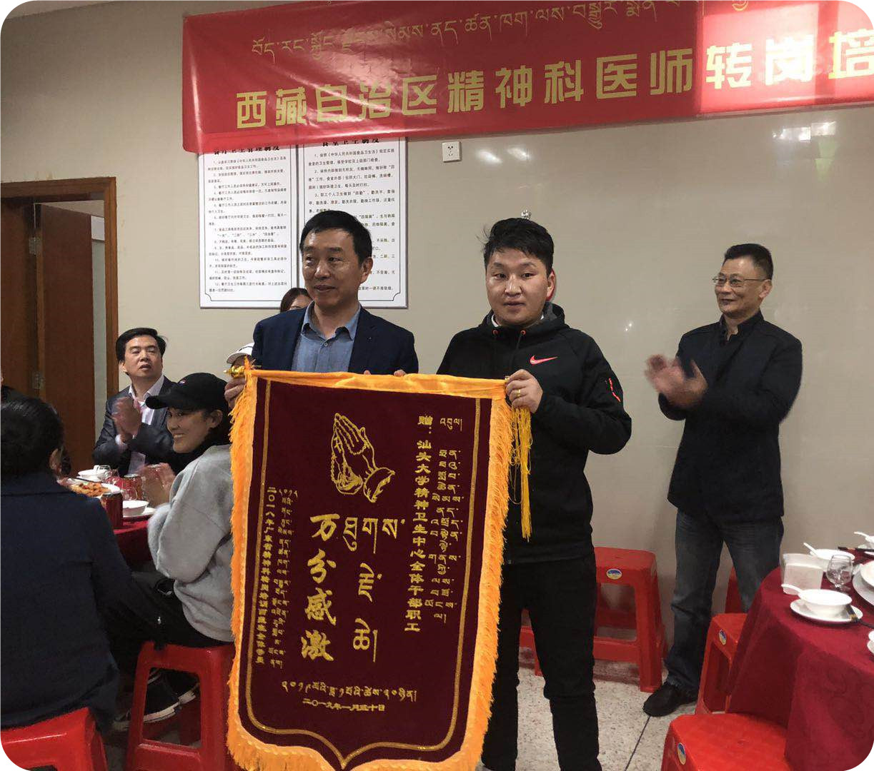 1月30日晚,精神卫生中心举办西藏自治区精防医生培训班师生联谊会,对3个月的培训进行了总结交流。学员代表在发言中感谢各级领导对本次培训班的支持与关注,以及感谢汕大精神卫生中心全员在培训期间的悉心指导与关怀并致赠锦旗,同时还为各位的老师献上哈达致以最诚挚的祝福,大家载歌载舞,在欢声笑语中度过美好的一晚,畅享3个月来在学习中结下了深厚的情谊。